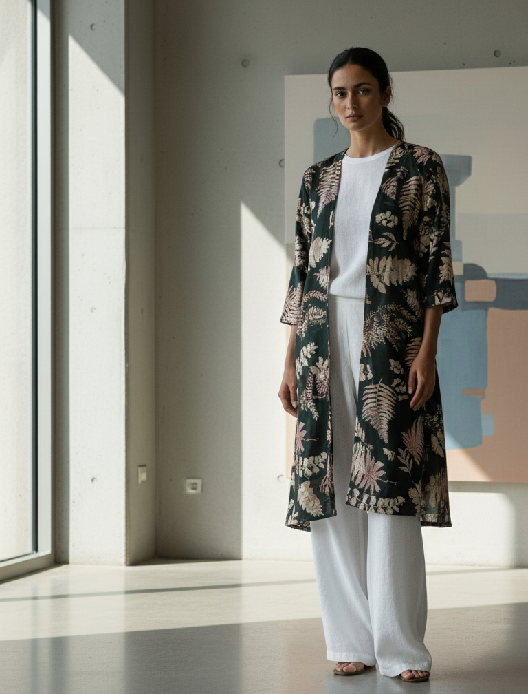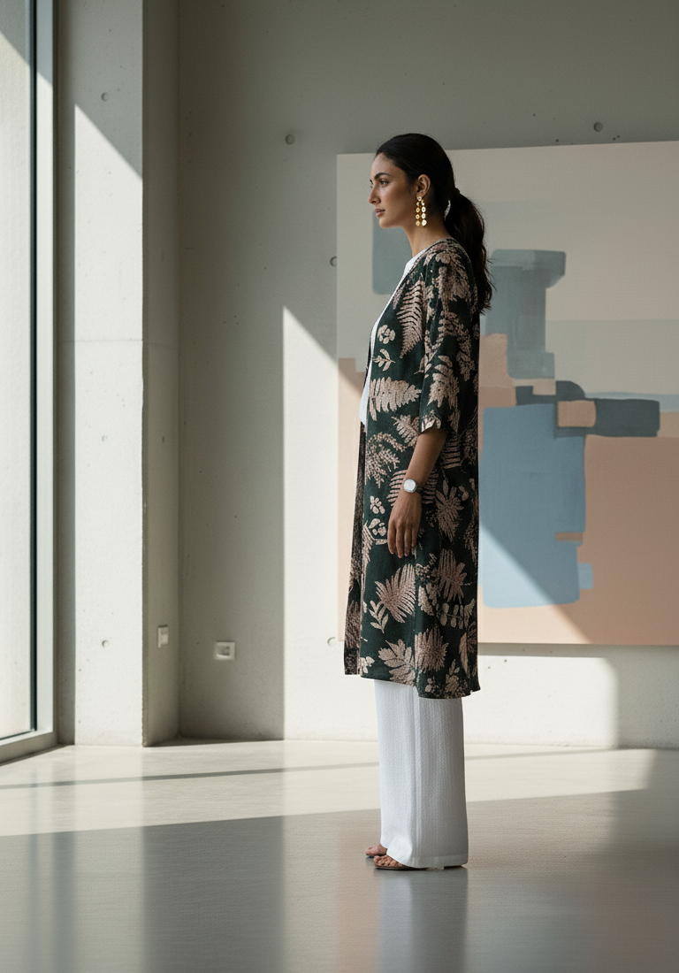 This long-line, open-front shrug is designed for dramatic, effortless layering. It features a rich, dark emerald green base adorned with a lush botanical print of ferns and foliage in muted shades of blush, beige, and earthy brown.