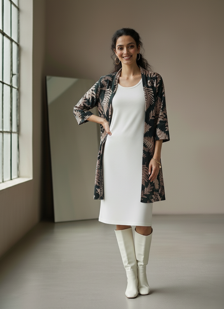 This long-line, open-front, three-quarter length shrug is designed for dramatic, effortless layering. It features a rich, dark emerald green base adorned with a lush botanical print of ferns and foliage in muted shades of blush, beige, and earthy brown.