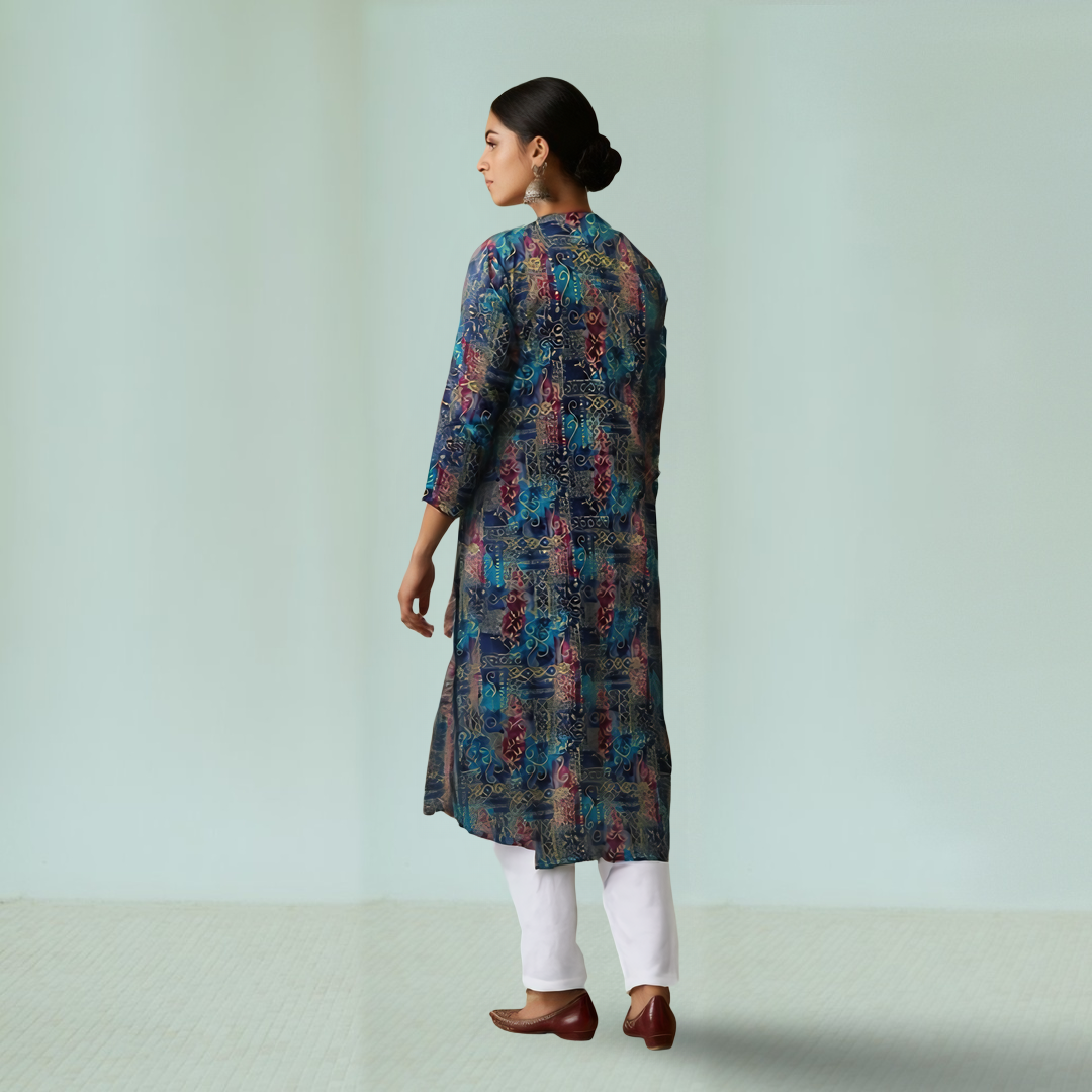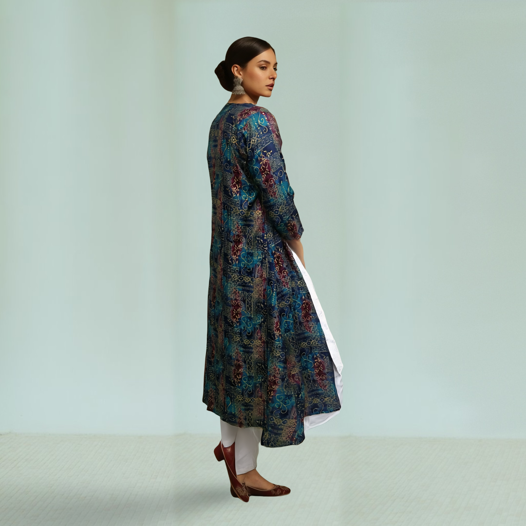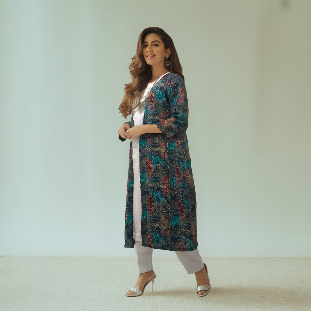 Immerse yourself in the allure of Midnight Azure, where deep royal blue meets glimmers of gold, teal, and wine. This long-length shrug flows with effortless grace, its ornate patterns adding a touch of old-world luxury to a modern silhouette. Perfect for layering over both classic and contemporary looks, it’s a statement of poise, mystery, and refined elegance.