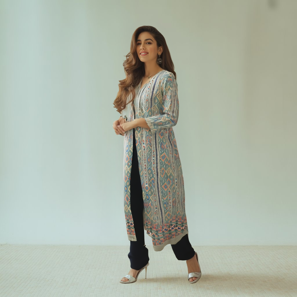 A flowing statement of elegance, Olive Odyssey drapes you in muted green sophistication. Crafted in a lightweight, breathable fabric with intricate ethnic patterns, it blends timeless tradition with modern grace. Its long, fluid silhouette flatters every movement, making it the perfect layer for both elevated everyday wear and special occasions.