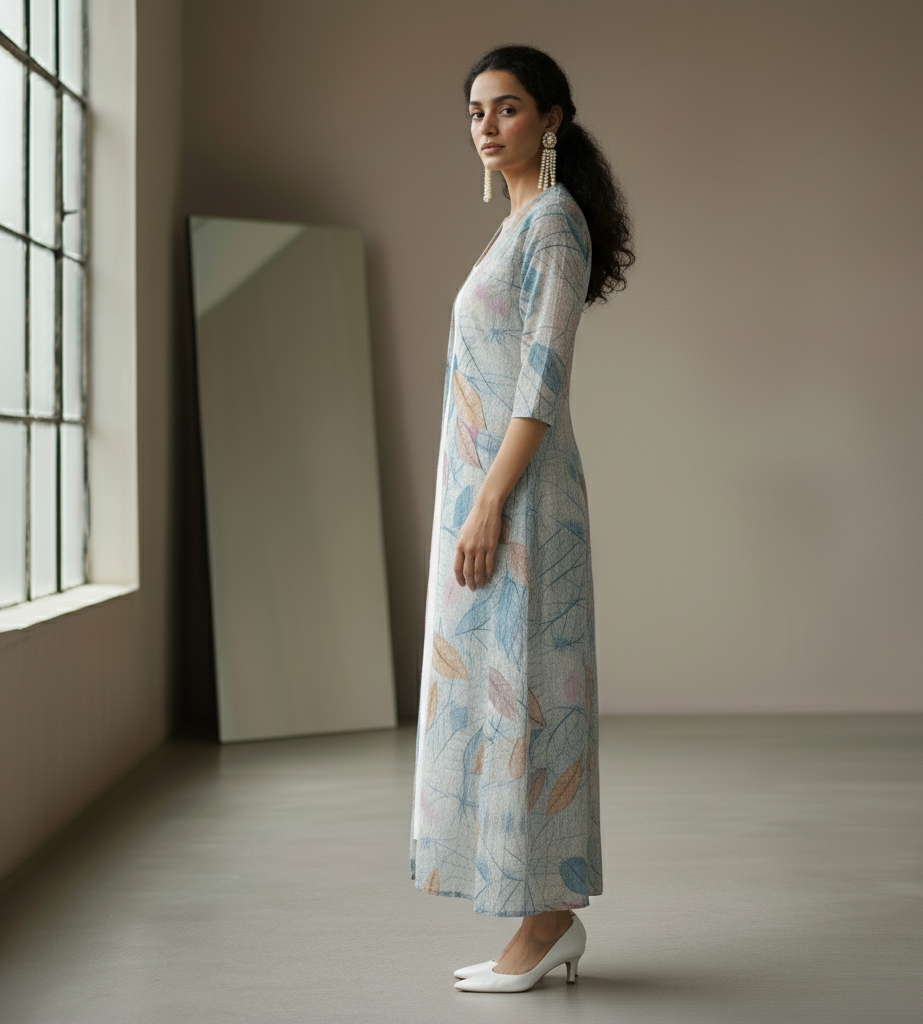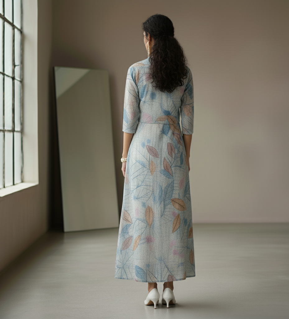 Design & Style: The Sky Bloom Shrug is an elegant, long-line outer layer designed to add a touch of effortless style and sophistication to any ensemble. It features a stunning, all-over leaf print in a soothing palette of sky blue, muted rose, and earthy brown hues, set against a soft, light grey or off-white background. The print is reminiscent of delicate foliage caught in a gentle breeze.