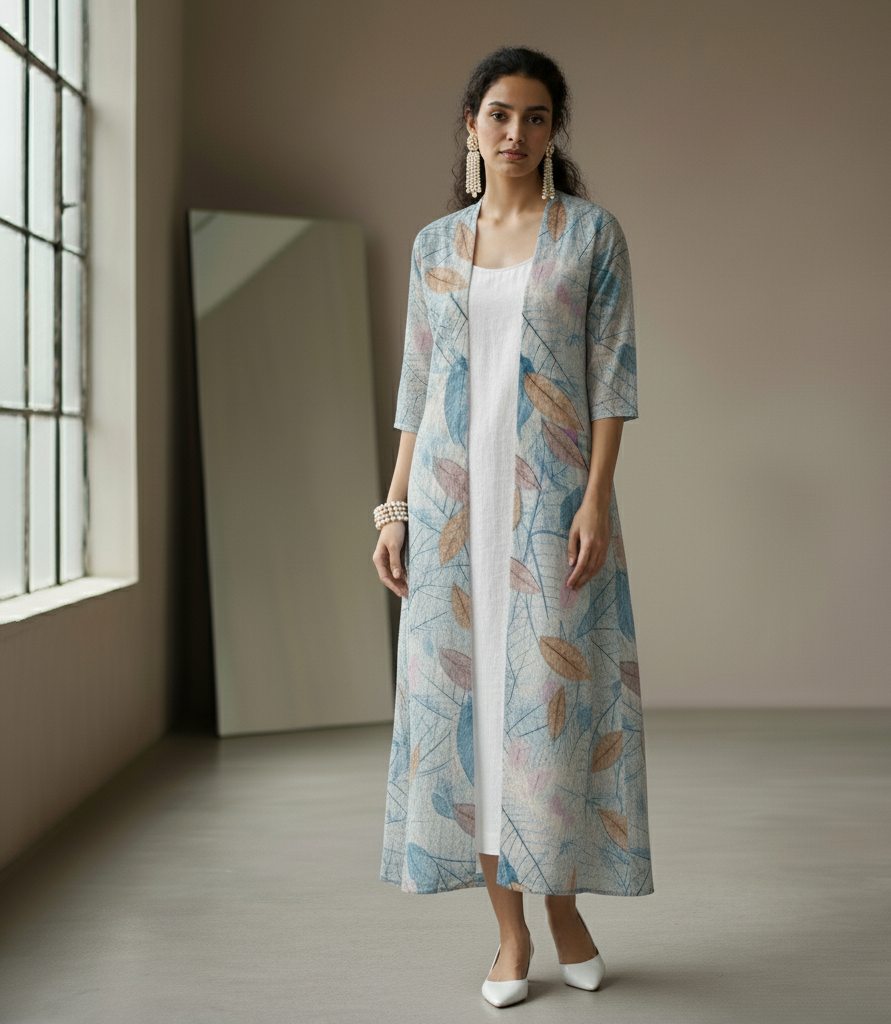Styling Suggestion (as shown): It is perfectly paired with a simple, crisp white inner dress or slip (like the one pictured) for a polished, contemporary look. It can also be layered over jeans and a tank top, or a solid-colored kurta/dress.